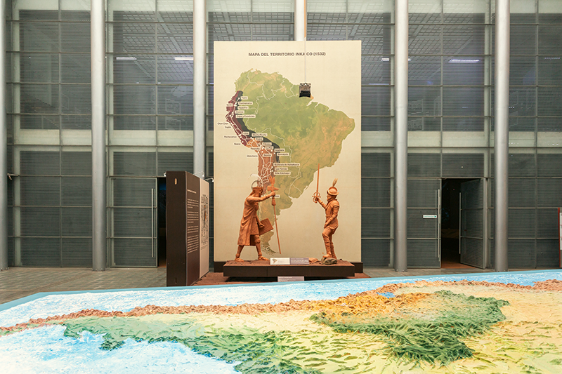 La segunda sala nos lleva a un momento neurálgico de nuestra historia, y por tanto del territorio: la conquista española; aquella, aparte de saquear, cercenó la tierra a partir de conflictos internos y ambiciones personales. De esta forma se muestra el proceso de conquista, reducciones, virreinatos y la convergencia de creencias basadas en la relacionalidad de los seres superiores a una creencia monoteísta, impuesta en muchas ocasiones con la espada. Se muestra también a algunos héroes de la independencia, quienes fueron en contra de la corona y dieron las luces para el territorio que actualmente conocemos como Bolivia, que también sufrió fracturas en su vida republicana. La sala se engalana con un mapa que nos muestra a Sudamérica sin fronteras, sin divisiones y con todo su potencial natural.